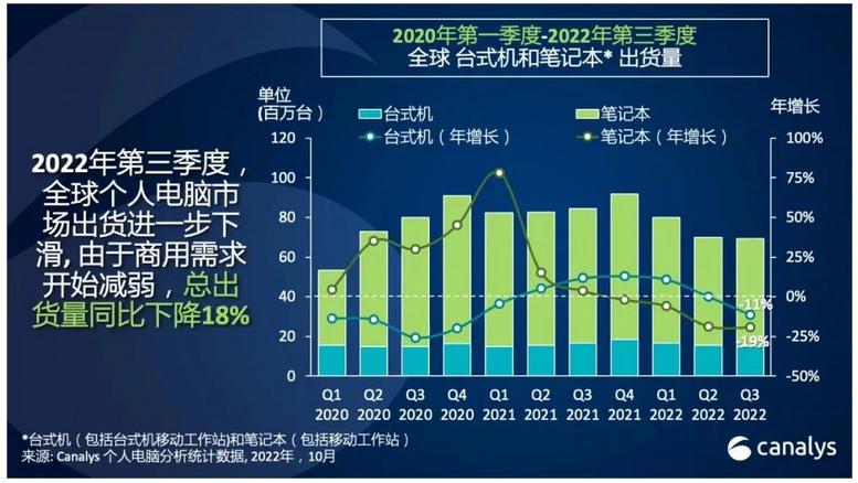 第三季度筆記本電腦出貨量受影響最大,同比下降19%,至5470萬臺;臺式機出貨量總計為1470萬臺,同比下降11%。平板電腦相對平穩,第二季度全球出貨量達4050萬臺,同比增長0.15%。