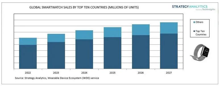可穿戴方面,2022年全球智能手表銷量同比增長17%,并保持17%這個強勁的勢頭一直增長到2027年。