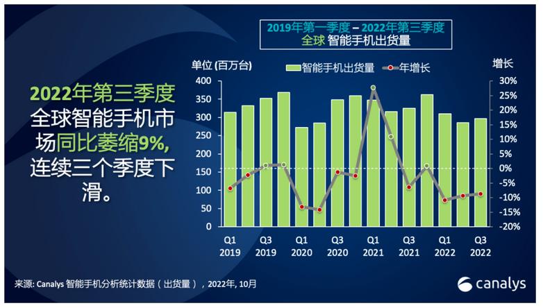 智能手機,今年三季度全球市場同比下降9%,已經是連續三個季度下跌,同樣是自2014年以來表現最糟糕的第三季度。
